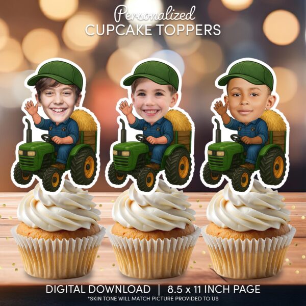 Personalized Farm Tractor Cupcake Toppers with Face - Printable Barnyard Birthday Decoration