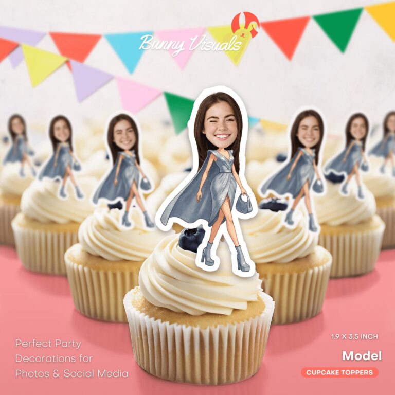 Transform your dessert table into a high-fashion runway with these personalized model cupcake toppers suitable for teens, young adults, and fashion-forward ladies. The design features a chic illustration of a supermodel strutting confidently in a shimmering silver wrap dress with dramatic cape sleeves, matching platform boots, and a stylish handbag. Perfect for fashionistas and style icons, these custom toppers allow you to place the birthday girl's face directly onto the catwalk body, creating a humorous yet glamorous focal point. Whether you are hosting a Vogue-inspired birthday bash, a bachelorette party, or a Sweet 16, these decorations provide an expert touch of haute couture to your cupcakes. The high-quality visual details ensure that every photo taken at your event looks professionally styled and social media ready.