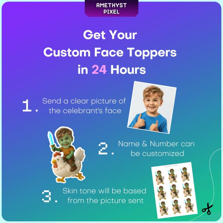 Level up your child’s next birthday celebration with these hilarious and unique personalized photo cupcake toppers featuring the infamous zombie chicken jockey. Expertly designed to transform your child's uploaded photo into a green-skinned character, this decoration depicts them riding a plump white chicken while brandishing a blue pixel-style sword. Perfect for dedicated young gamers, each topper measures approximately 2.1 x 3.5 inches, ensuring they stand out boldly on standard cupcakes or muffins. Whether you are hosting a voxel-themed event or a general video game birthday bash, these custom face cutouts provide an immersive, fun element that guests will instantly recognize. The high-resolution design captures the whimsical excitement of surviving the night in a blocky world, making your dessert table the ultimate spawn point for party fun.