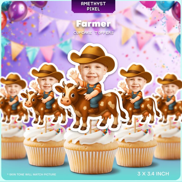 Bring the charm of the countryside to your dessert spread with these adorable custom face farmer cupcake toppers. Designed specifically for toddlers and young children, this spirited decoration features your little boy’s smiling face superimposed onto a character wearing rugged denim overalls and a wide-brimmed brown cowboy hat while riding a gentle brown-and-white spotted cow. Perfect for a "My First Rodeo" event or a classic barnyard bash, each topper is expertly designed to make a bold statement on standard cupcakes. We prioritize quality editing to ensure the neck and skin tone on the illustration harmonize with your uploaded photo, providing a seamless and professional look that delights party guests and creates memorable photo opportunities.