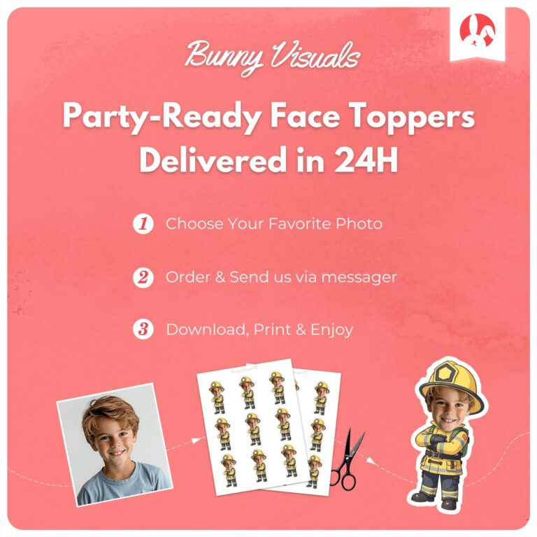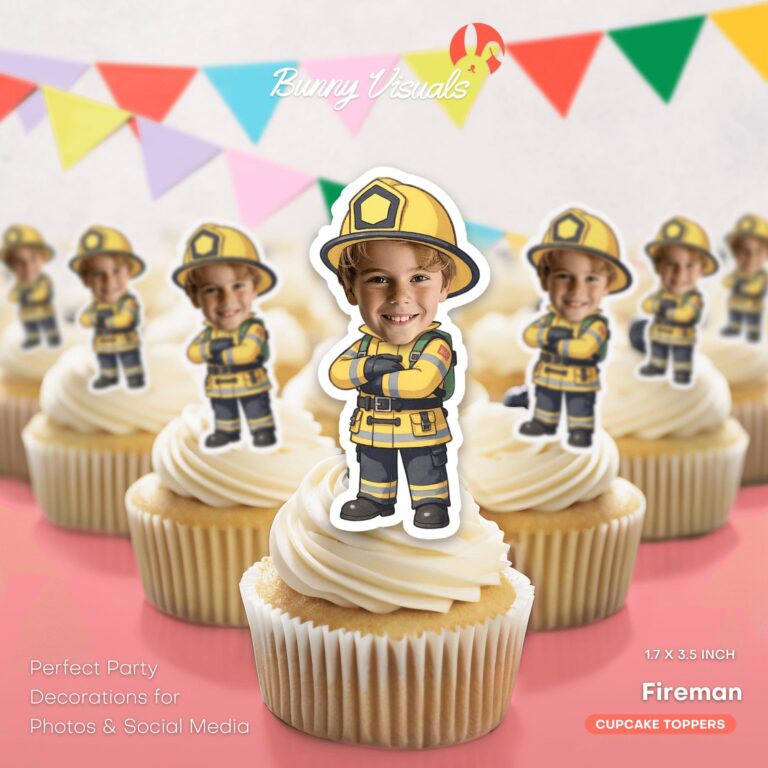 Ignite the excitement at your little hero’s next celebration with these professionally designed custom firefighter cupcake toppers. Featuring a vibrant yellow turnout coat, protective helmet, and a confident crossed-arms stance, these decorations instantly transform a photo of your child into the brave captain of their own fire station party. Ideally suited for young boys aged 4 to 8 who dream of saving the day, these 1.7 x 3.5-inch cutouts are sized perfectly to stand tall on frosted cupcakes or muffins. The high-resolution design captures the classic fireman aesthetic, ensuring that your dessert table becomes the centerpiece of the event. As a digital printable solution, these toppers offer parents a quick, high-quality way to add a personalized touch that guests will talk about long after the candles are blown out.