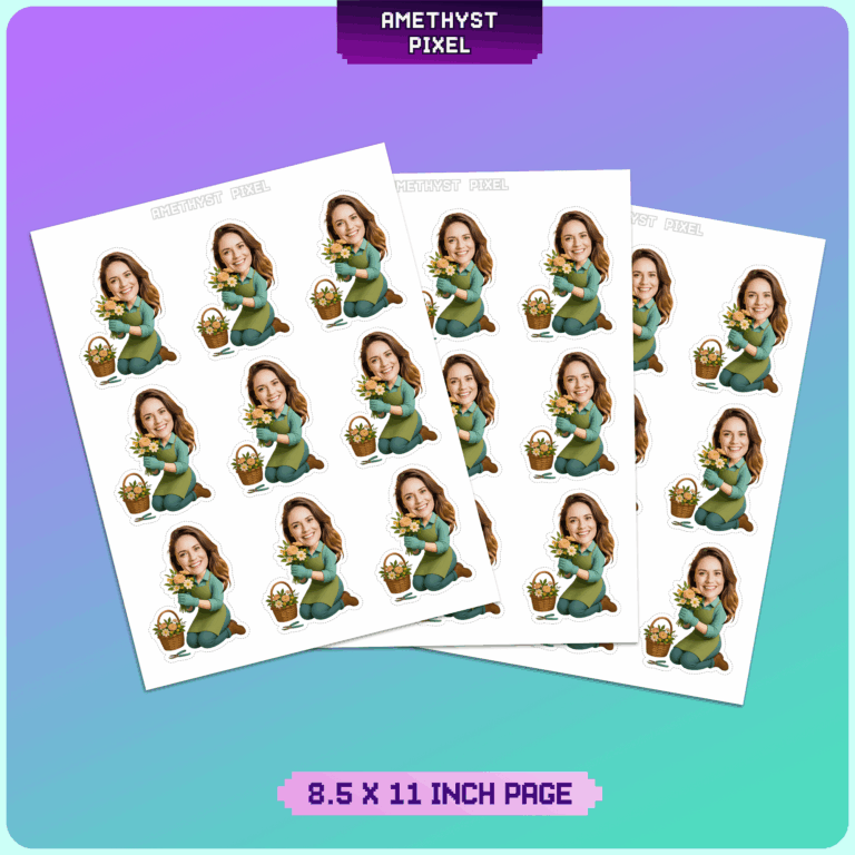 Celebrate the green thumb in your life with these charming florist-themed custom face cupcake toppers. This printable design features a delightful character body dressed in a teal shirt and classic green gardening apron, complete with gloves and blue trousers. The figure is depicted kneeling beside a woven basket full of blooms and a pair of pruning shears, holding a fresh bouquet of flowers for a heartwarming touch. Perfect for adults, retirees, or garden enthusiasts, this digital download allows you to transform a standard portrait into a fun, personalized party decoration. The high-resolution files ensure that the vibrant greens and floral colors print beautifully on cardstock for a professional DIY finish.