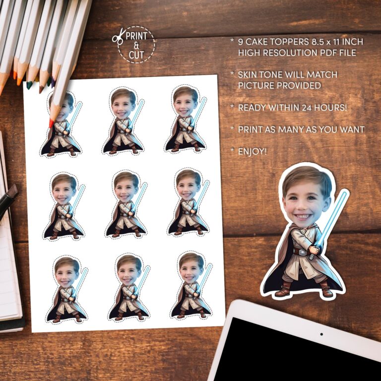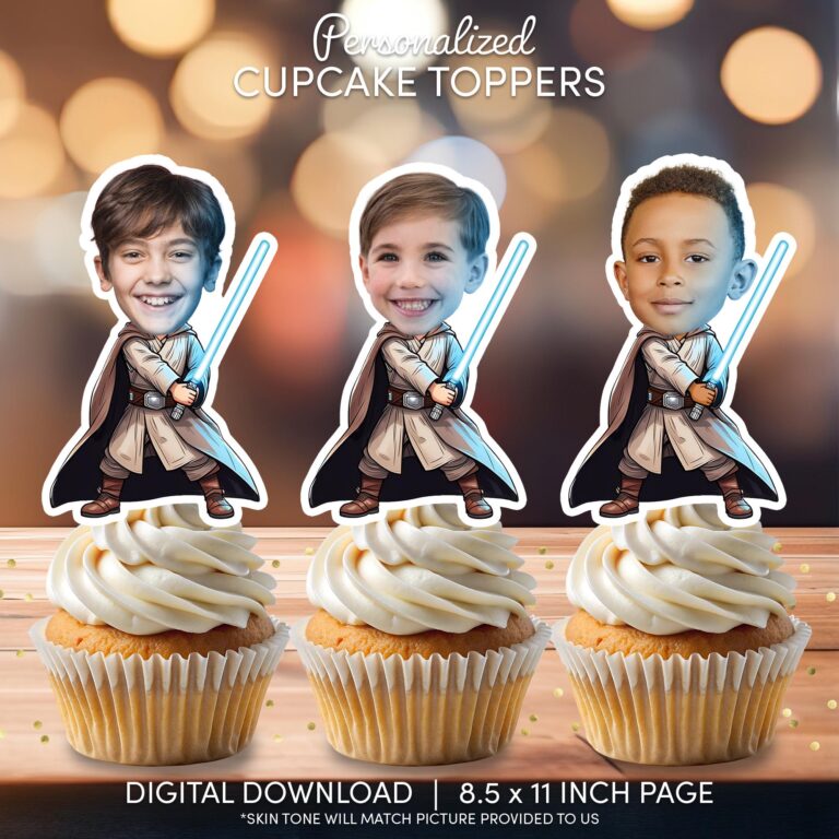 Bring the force of fun to your dessert table with these custom galactic warrior cupcake toppers. This personalized digital design features your child's face superimposed onto the body of a brave space knight, complete with traditional beige robes, a brown cape, and a glowing blue light sword. Perfect for young fans of intergalactic adventures and sci-fi movie themes, these toppers are designed to be the highlight of a boy's birthday celebration. As a trustworthy digital download, we professionally crop your photo and adjust the character's neckline skin tone to match the picture provided, ensuring a seamless and realistic look. You can print as many copies as you need at home to create a memorable and exciting space-themed party atmosphere.