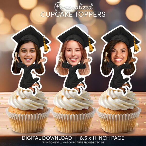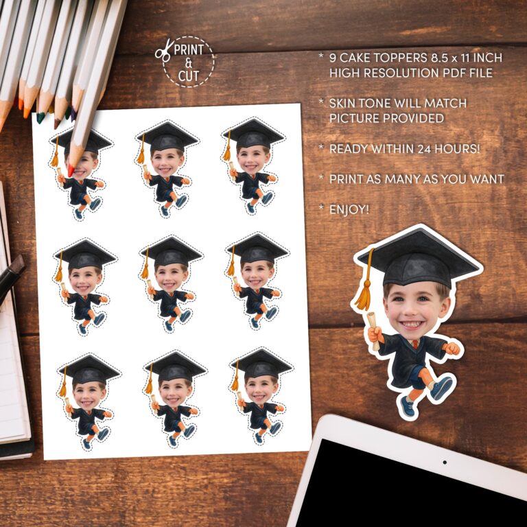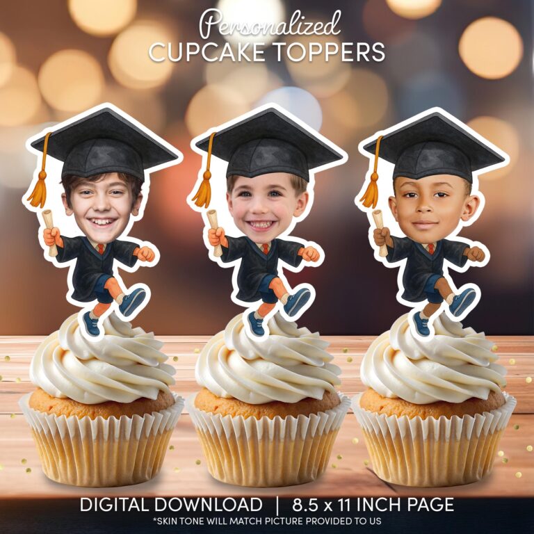 Make your graduate’s special day unforgettable with these lively custom face cupcake toppers. Featuring a fun cartoon design of a graduate leaping for joy in a classic black cap and gown while holding a diploma, these printable decorations are ideal for celebrating academic milestones. Best suited for Pre-K, kindergarten, and elementary school graduates, this digital download transforms your favorite photo into a unique party accent. The design includes skin tone matching based on your provided picture to ensure a seamless look on the cartoon body. Simply print on high-quality paper, cut, and display to bring a personal and spirited touch to your dessert table.