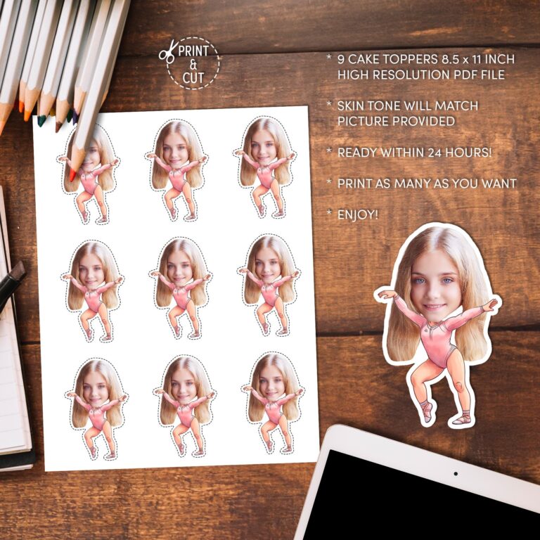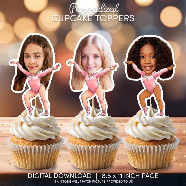 Celebrate your little athlete's big day with these personalized gymnastics cupcake toppers, featuring a fun illustration of a gymnast in a classic pink leotard. Designed primarily for children and pre-teens who love the sport, these printable decorations place your child's face right in the center of the action. The design process includes careful skin-tone matching based on the photo you provide, ensuring the illustration blends naturally with your child's picture for a high-quality finish. As a digital download, this product allows you to print as many copies as you need from home or a local print shop. The toppers feature a clear white outline that makes cutting them out by hand simple and precise, perfect for adding a custom touch to birthday cupcakes or team treats.