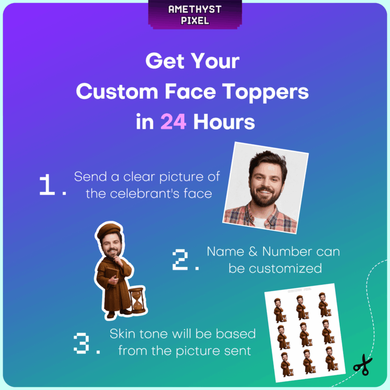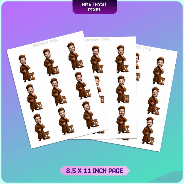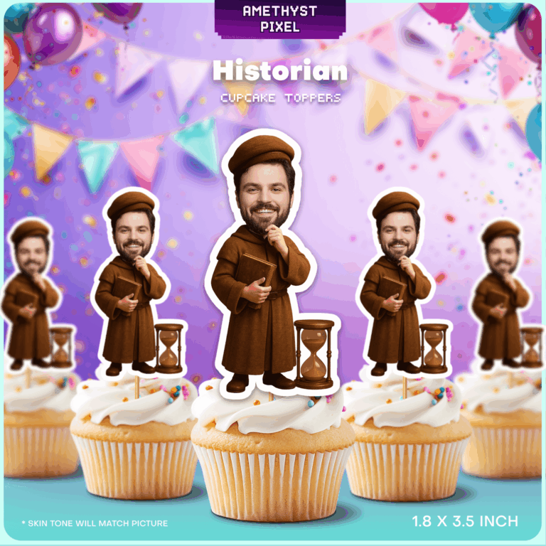 Celebrate the past with these delightful custom face cupcake toppers, featuring a scholarly historian design perfect for history buffs, teachers, and academics. The design showcases your uploaded photo on a character wearing traditional brown robes and a cap, clutching a thick book while standing next to a classic hourglass prop. Best suited for adults, retirees, or university graduates, these printable toppers add a personalized, intellectual touch to dessert tables. Upon purchase, you will receive a high-resolution digital file ready for home printing; simply provide a clear, front-facing photo to ensure the best visual quality for your historical celebration.