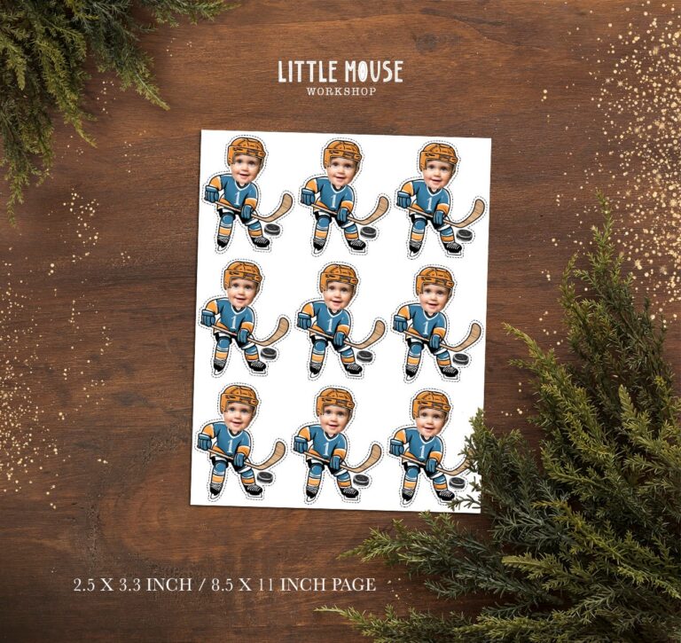 Celebrate your little athlete’s big milestone with these professionally crafted hockey custom face cupcake toppers, specifically designed for a high-energy first birthday bash. Each topper showcases a dynamic cartoon body sporting a blue jersey with distinctive orange stripes, a protective helmet, and the number "1" prominently displayed on the chest, turning your baby’s photo into the star player on the ice. Ideal for "Rookie of the Year" themes or classic ice hockey parties, these digital printable decorations measure approximately 3.3 inches tall and are formatted on standard 8.5 x 11-inch sheets for effortless printing and cutting at home. The detailed illustration includes essential gear like gloves, skates, and a hockey stick handling a puck, ensuring an authentic sports aesthetic for your dessert table.