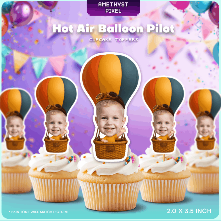 Personalized Hot Air Balloon Pilot Face Cupcake Toppers - Printable Adventure Birthday Decor