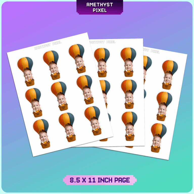 Send your celebration soaring with these whimsical custom face hot air balloon toppers, perfect for adding a touch of vintage adventure to any dessert table. This printable design transforms your guest of honor into an adorable pilot, complete with aviator goggles, sitting inside a classic woven basket beneath a vibrant orange, yellow, and teal balloon. Ideally suited for "Time Flies" first birthdays, baby showers, or travel-themed parties for toddlers and young children. As a digital download, this product ensures you receive a high-resolution file that provides crisp, colorful results when printed on quality paper. The charming illustration style makes these toppers a standout addition to cupcakes, donuts, or savory party snacks.