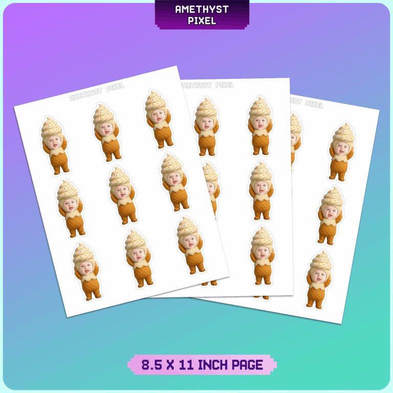 Transform the guest of honor into the sweetest treat on the dessert table with these adorable ice cream cone custom face cupcake toppers. Perfect for a summer celebration or a dessert-themed birthday, this digital design features a hilarious and cute waffle cone bodysuit topped with a creamy soft-serve hat complete with rainbow sprinkles. The design wraps your submitted photo in a whimsical look that is guaranteed to crack smiles at any event. Ideal for babies and toddlers celebrating a "Two Sweet" birthday or a first birthday ice cream social, these printable toppers act as engaging conversation starters. As a high-resolution digital download, you can print as many as you need on quality cardstock to ensure the colors pop and the decorations stand tall on your cupcakes.