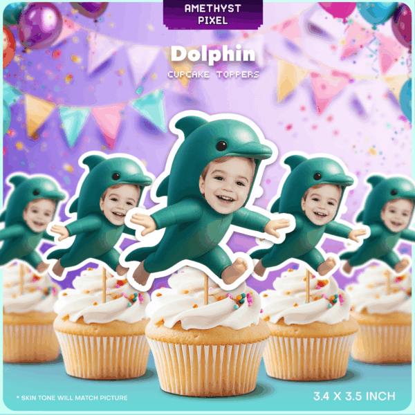 Personalized Dolphin Custom Face Cupcake Toppers for Under the Sea Birthday Parties