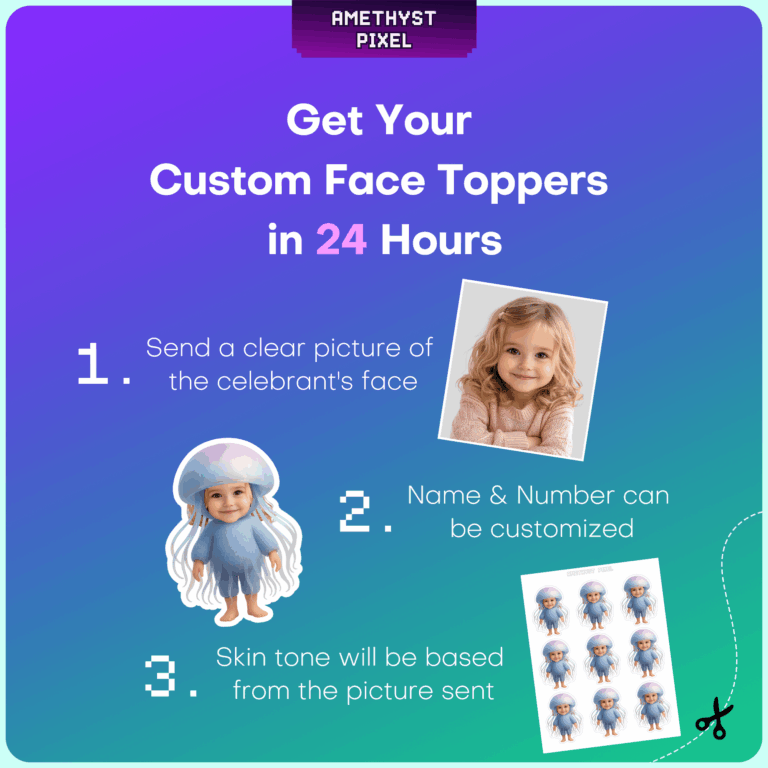 Transform your little one into the cutest creature of the deep with these custom face jellyfish cupcake toppers. Ideal for toddlers and young children celebrating with an "Under the Sea" or ocean theme, this printable design features a whimsical blue outfit with a translucent, bubbly head and trailing tentacles. Simply provide a clear photo of the birthday boy or girl, and you will receive a digital file optimized for home printing. Because these are digital downloads, you can print as many as you need to cover every treat on the dessert table. The high-resolution design ensures that the soft colors and fun costume details print crisply on cardstock, making for a memorable and hilarious addition to your marine-themed event.