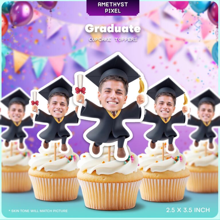 Celebrate the culmination of academic hard work with these spirited personalized graduation cupcake toppers, designed to capture the pure joy of commencement. Each 2.5 x 3.5-inch decoration features your graduate’s unique photo seamlessly integrated onto a dynamic body, shown leaping in a traditional black cap and gown while clutching a ribboned diploma. The detailed design includes a classic mortarboard with a gold tassel and formal attire, making it an ideal choice for high school open houses, college degree celebrations, or university after-parties. These custom face toppers transform standard bakery treats into a tribute to the student's success, functioning as both a fun conversation starter and a high-quality decor element that ties your specific party theme together with professional flair.