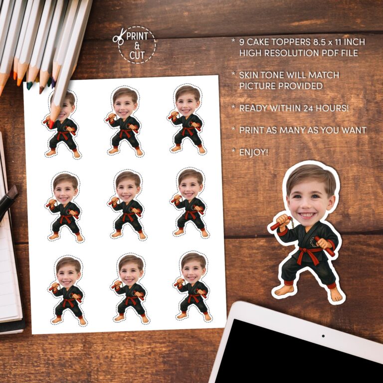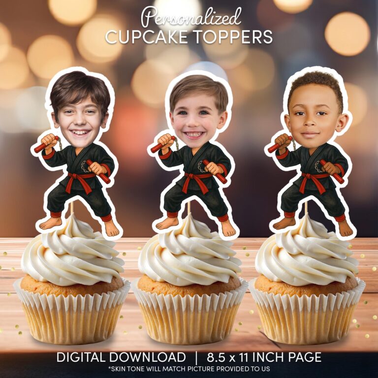 Transform your dessert table into a black-belt level display with these action-packed custom face cupcake toppers. Designed for the ultimate martial arts enthusiast, this printable decoration features a dynamic cartoon fighter wearing a black gi with a red belt and holding nunchucks, ready for action. Perfect for boys and girls aged 4 to 12 who love karate, taekwondo, or ninja themes, this digital download puts the birthday child right in the center of the excitement. We carefully edit your provided photo to ensure the skin tone on the cartoon body matches your child seamlessly. Whether you are hosting a party at a local dojo or a backyard kung fu bash, these easy-to-assemble toppers turn ordinary cupcakes into memorable, high-energy treats that guests will love.