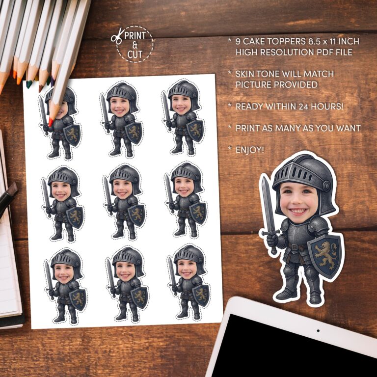 Transform the guest of honor into a brave warrior with these personalized knight cupcake toppers, perfect for adding a legendary touch to any medieval-themed celebration. This digital download features a detailed suit of armor design, complete with a sword in hand, a raised-visor helmet, and a shield displaying a classic golden lion crest. Ideally suited for children's birthday parties, the design allows you to showcase your child's smiling face atop a fun, cartoon-style knight body. As a print-at-home file, this allows for unlimited printing for your event needs. The design process ensures the skin tone around the neck area is adjusted to match the photo you provide, creating a seamless and high-quality look for your dessert table display.