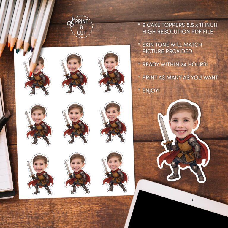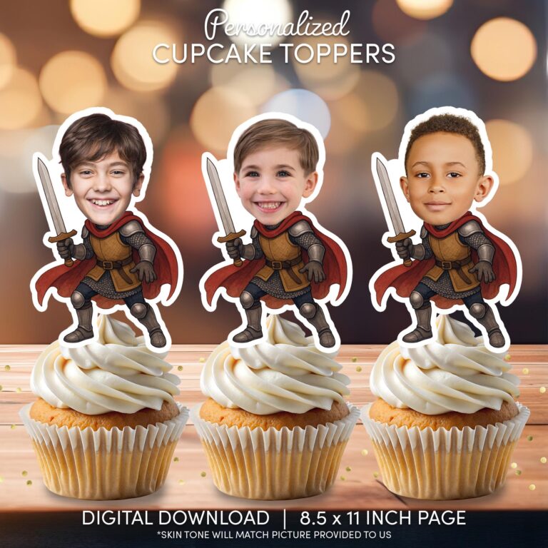 Transform the guest of honor into a brave hero with these personalized knight cupcake toppers, perfect for a medieval or fantasy-themed birthday celebration. This digital download features a gallant cartoon body wearing detailed chainmail armor, a leather tunic, and a flowing red cape while wielding a sword. Simply provide a clear photo of your child, and the design is customized to match their skin tone to the body for a seamless look. Ideal for children aged 3 to 10, these printable decorations add a fun, immersive touch to your dessert table. The design includes a white border to make cutting by hand easy and clean.