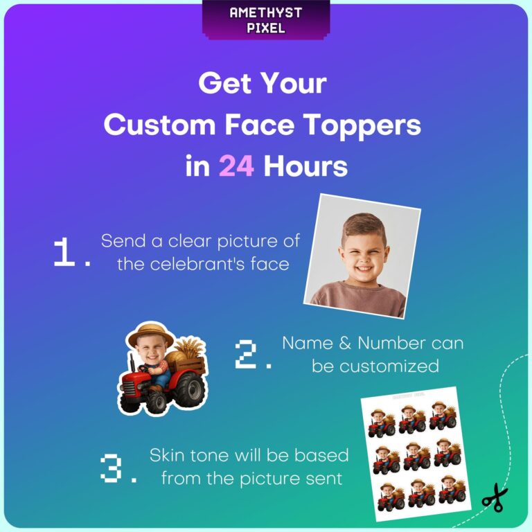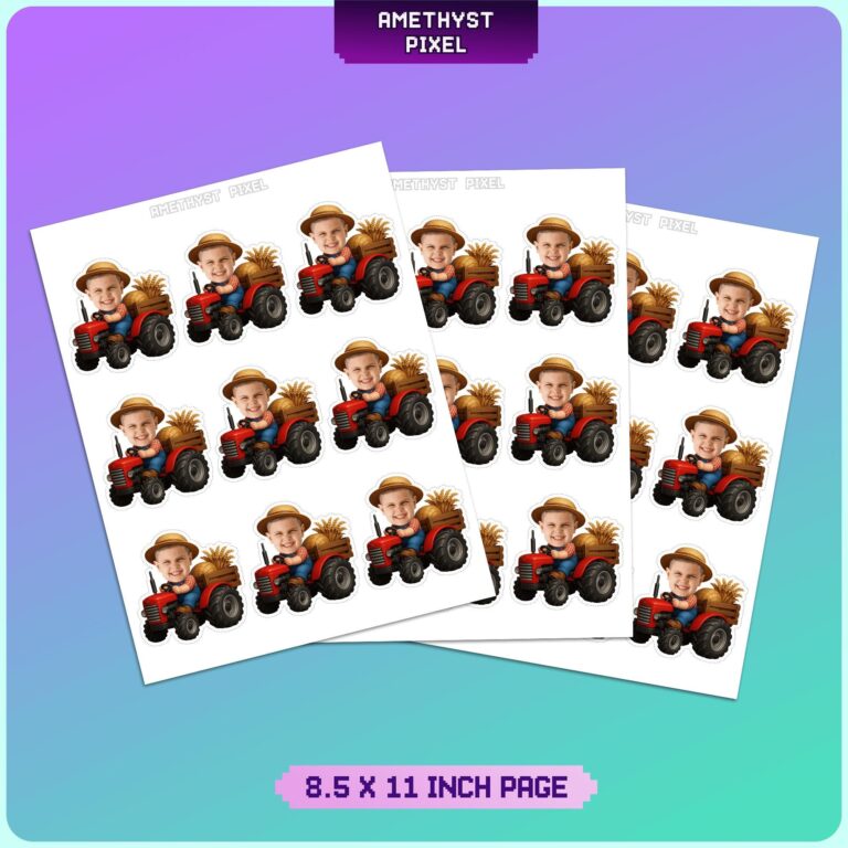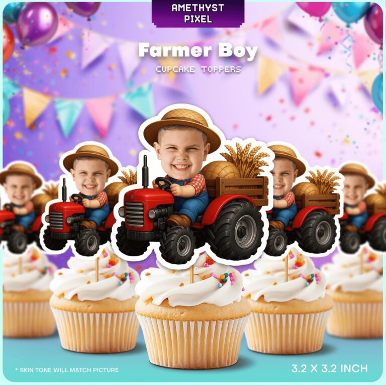 Transform your dessert table into a bustling harvest celebration with these professionally designed custom face cupcake toppers, featuring your toddler as the star farmer. Expertly illustrated to capture the charm of rural life, this design displays your child wearing denim overalls and a classic straw hat while steering a sturdy red tractor loaded with golden wheat bundles. Ideal for a young boy’s farm-themed birthday or barnyard bash, these printable decorations offer a high-quality, personalized touch that elevates standard party styling. Whether you are hosting an 'Old MacDonald' event or simply celebrating a child who loves heavy machinery, these unique photo accents serve as excellent conversation starters and memorable keepsakes. The vivid colors and precise 3.2-inch sizing ensure they stand out beautifully on buttercream cupcakes or rustic snack displays.