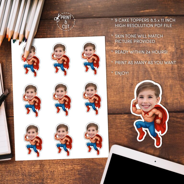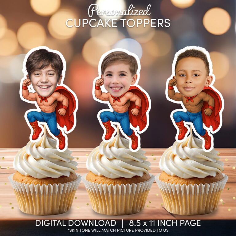 Transform the guest of honor into the main event with these hilarious custom face Lucha Libre cupcake toppers. Perfect for wrestling fans and high-energy birthday bashes, this digital printable features a dynamic wrestler body clad in blue tights, red boots, and a flowing red cape. Whether you are hosting a "Nacho Average Party" or a classic Mexican wrestling fiesta, these photo-based decorations add a unique and funny touch to your dessert table. The design process includes professional editing to ensure the wrestler's skin tone matches the photo you provide for a seamless look. Delivered as a ready-to-print file, these toppers are simple to cut out and assemble, making them an easy DIY project that delivers a champion-level impact.
