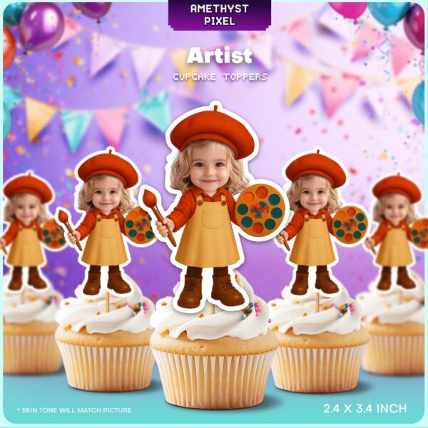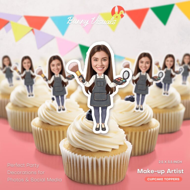 Elevate your beauty-themed celebration with these professionally designed makeup artist cupcake toppers, tailored specifically for cosmetologists and beauty gurus. Each topper showcases a meticulously illustrated body wearing a stylist’s apron, clutching a fluffy powder brush and a colorful makeup palette, ready to be personalized with the unique face of your guest of honor. Ideal for adult birthday festivities, cosmetology school graduations, or salon launch events, these custom photo decorations add a sophisticated yet fun touch to your dessert spread. By incorporating specific trade tools into the design, these toppers resonate deeply with professional MUAs, ensuring the decor feels authentic and thoughtful while creating perfect photo opportunities for social media sharing.