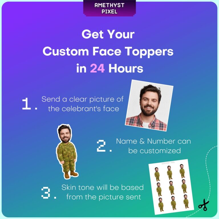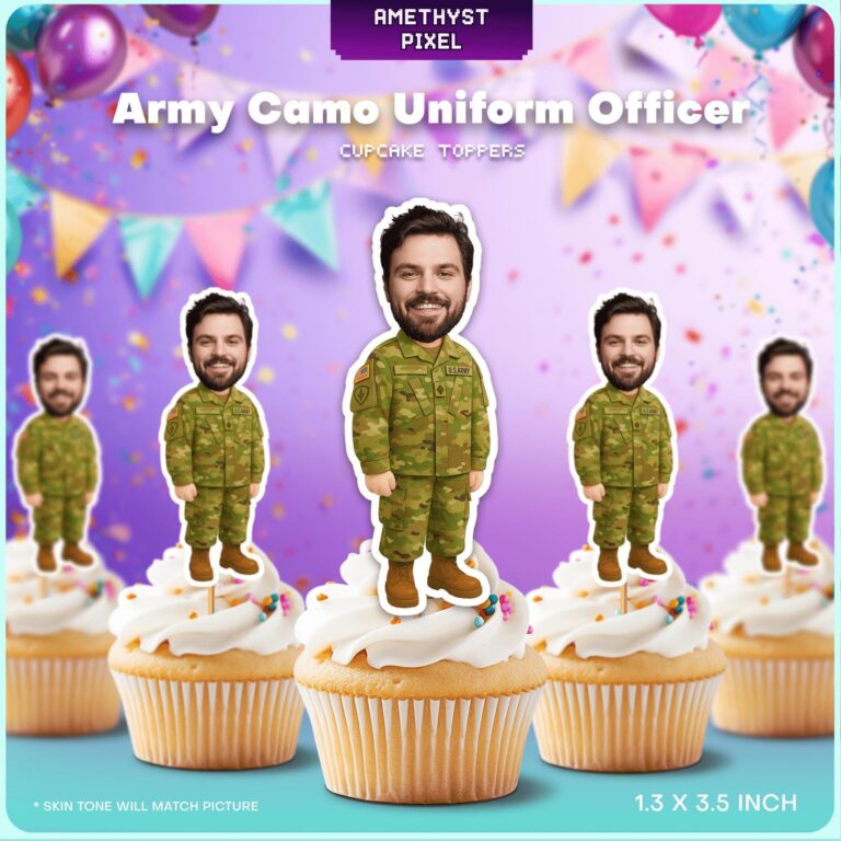 Transform your dessert table into a salute to service with these expertly designed, highly realistic military officer cupcake toppers. Perfect for honoring an enlistment, promotion, or retirement, these custom decorations feature a classic green camouflage combat uniform complete with tactical brown boots and authentic patch detailing. Upon receiving a clear photo, we professionally crop the face to seamlessly match the soldier's body, ensuring the neck skin tone aligns perfectly with your subject for a natural look. Standing at approximately 3.5 inches tall, these unique toppers add a humorous yet respectful personal touch to any army-themed gathering, making your guest of honor the commanding officer of the celebration.
