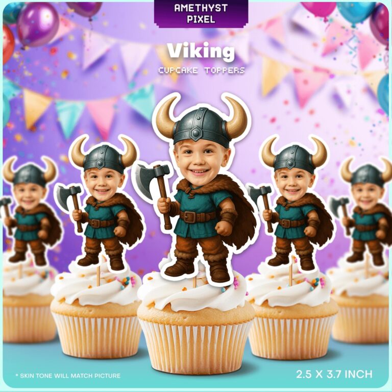 Transform your little adventurer into a legendary Norse hero with these highly detailed Custom Face Viking Cupcake Toppers. Perfect for young children celebrating a warrior or dragon-training themed birthday, this design features a rugged cartoon body clad in a teal tunic, brown trousers, and a fur-lined cape, complete with an iconic horned helmet and a playful battle axe in hand. Unlike generic decorations, these personalized cutouts put your child’s smiling face right in the center of the action, creating a hilarious and memorable focal point for the dessert table. Sized at approximately 2.5 x 3.7 inches, they serve as excellent conversation starters and high-quality photo props, ensuring your event feels expertly curated and uniquely special for the guest of honor.