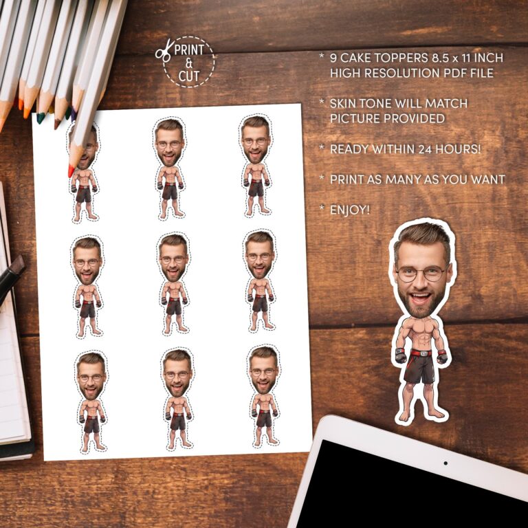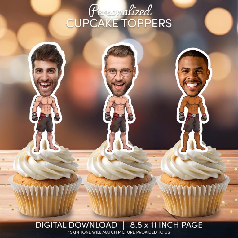 Bring a knockout touch to your next celebration with these personalized MMA fighter cupcake toppers. Designed for the ultimate champion in your life, this digital download transforms your guest of honor into a muscle-bound fighter wearing gloves and shorts, ready for the ring. Perfect for adult birthdays, bachelor parties, or fight night gatherings, these custom photo decorations add a hilarious and memorable element to your dessert table. We customize the design by cropping your submitted photo and adjusting the body's skin tone to match, ensuring a seamless and realistic look. Simply print the files on sturdy paper and assemble them at home for an instant party hit.