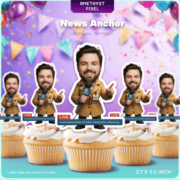 Custom Face News Anchor Cupcake Toppers - Breaking News Reporter Party Decoration
