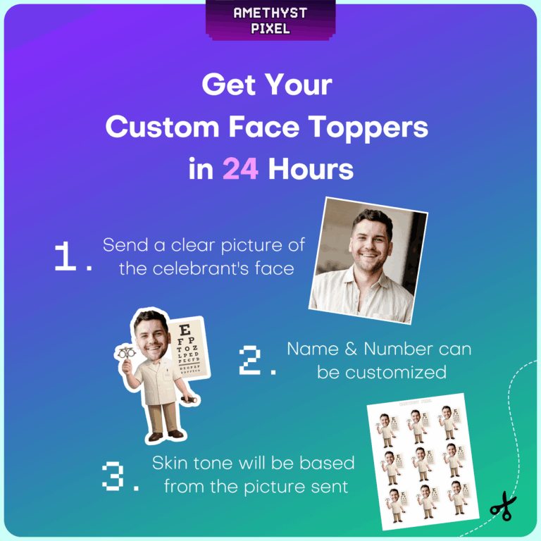 Celebrate the vision care professional in your life with these custom face optometrist cupcake toppers, designed to bring humor and personalization to any medical-themed event. This digital download features a cartoon body dressed in a professional beige medical coat, holding a phoropter and penlight, with a classic Snellen eye chart displayed prominently in the background. Simply upload a clear photo of the guest of honor to transform them into the star of the dessert table. These printable decorations are best suited for adults celebrating optometry school graduation, passing board exams, or retirement. For the finest presentation, we recommend printing on high-quality cardstock to ensure the details of the eye chart and medical instruments remain crisp and vibrant.