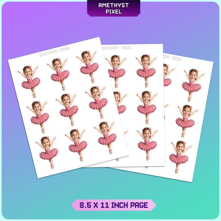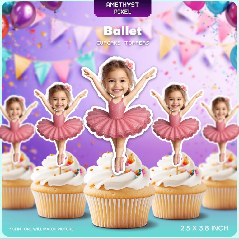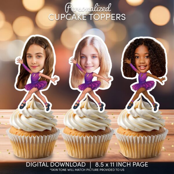 Make your little dancer the star of the show with these enchanting custom face ballerina cupcake toppers. Featuring a stunning dark pink sparkly tutu, posed arms, and graceful ballet slippers, this design perfectly captures the elegance of a classic dance-themed celebration. Ideal for a toddler’s birthday or a celebratory post-recital treat, these personalized decorations add a unique, heartwarming touch to your dessert table. The high-quality illustration ensures that the birthday girl's smile integrates seamlessly with the dancer body, creating a professional look that guests will love. Whether you are planning a 'tutu cute' second birthday or a pink ballet party, these custom photo toppers serve as memorable keepsakes and instant conversation starters, turning standard cupcakes into a personalized tribute to your child’s love for dance.