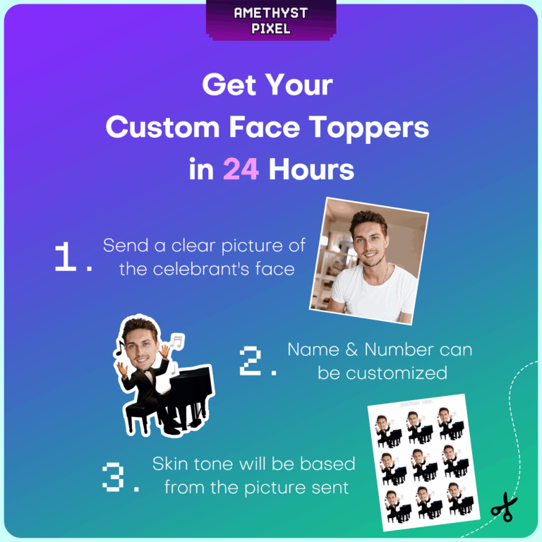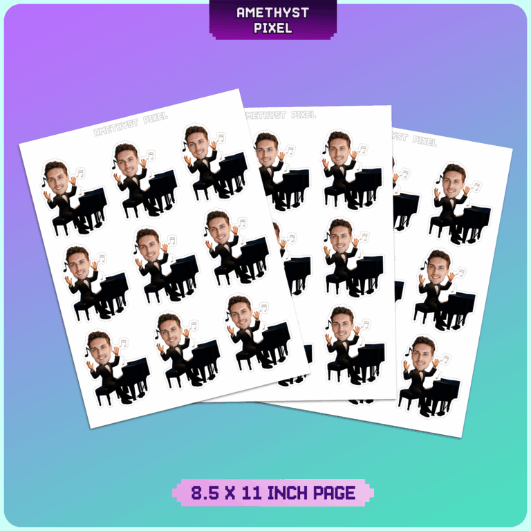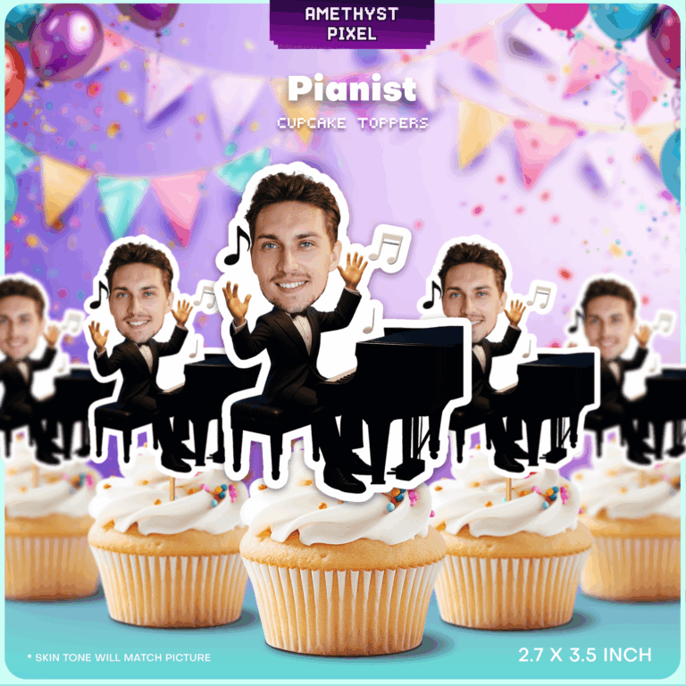 Celebrate the virtuoso in your life with these custom pianist face cupcake toppers, designed to bring a touch of musical elegance and fun to any event. Ideal for music teachers, concert pianists, or aspiring students, this printable party decoration features a body in a formal tuxedo seated at a grand piano, surrounded by floating musical notes. The design is customized with your provided photo, ensuring the skin tone matches your picture for a seamless look. As a digital download, this allows you to print as many as you need from home or a local print shop. For the best stability and print quality, we recommend using heavy white cardstock before cutting and assembling these unique tributes to your favorite musician.