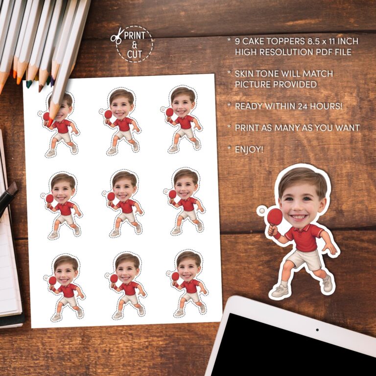 Serve up a winning celebration with these custom table tennis cupcake toppers, designed to make the birthday guest of honor the star of the match. We digitally place your uploaded photo onto a cartoon body of an energetic ping pong player, complete with a red paddle, athletic polo, and a ball in mid-air. This printable party decoration is ideal for children, teens, and sports enthusiasts planning a competitive or game-themed event. The design process includes skin tone matching to align the cartoon body with your provided picture for a seamless look. As a digital file, this allows you to print as many copies as you need from home, ensuring every dessert on the table features the MVP's face.
