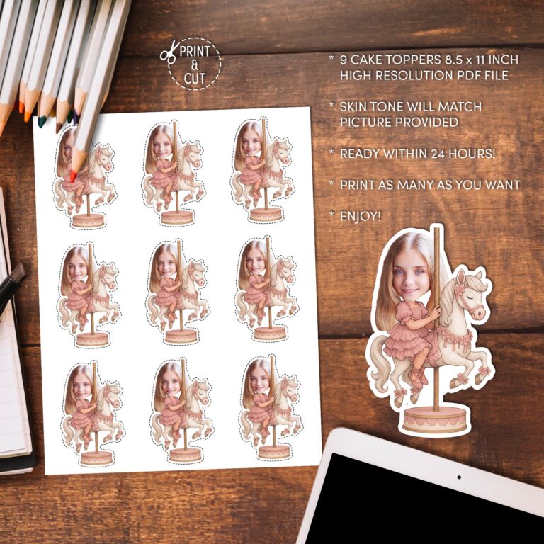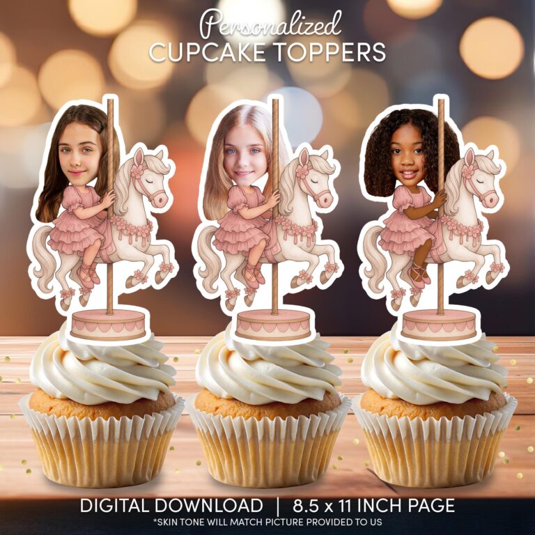 Create a whimsical and nostalgic atmosphere at your next event with these personalized carousel horse cupcake toppers. This digital download features a charming hand-painted style illustration of a white merry-go-round pony adorned with pink floral rosettes, where we custom-edit your child's face onto the rider's body. The design includes a sweet pink ruffled dress and ballet-style shoes, making it an adorable choice for a baby shower or a first birthday celebration. Simply upload a clear photo, and we will match the skin tone of the illustration to your picture for a seamless look. These printable toppers are designed for easy home printing and assembly, allowing you to add a unique, heartwarming touch to your dessert table without waiting for shipping.