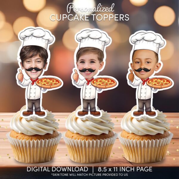 Personalized Pizza Chef Theme Custom Face Cupcake Toppers for Pizzeria Birthday Parties