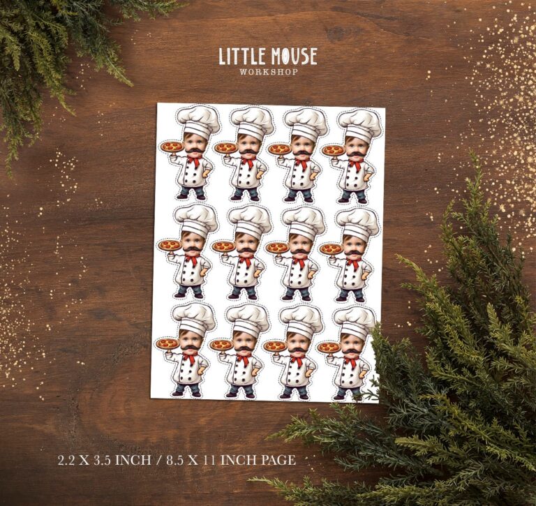Transform your little one into the head of the kitchen with these adorable custom pizza chef cupcake toppers, designed to bring a slice of fun to any pizzeria-themed birthday bash. Featuring a classic white double-breasted chef’s coat, a red neckerchief, and a tall baker’s hat, this charming design showcases your child holding a delicious pepperoni pizza while sporting a hilarious, digitally added handlebar mustache. Ideal for toddlers and young children, these printable decorations add a humorous and personalized touch to your dessert table. The high-resolution files are formatted for easy at-home printing on 8.5 x 11-inch sheets, with each topper measuring approximately 2.2 x 3.5 inches, ensuring they stand out perfectly on standard cupcakes or even savory party snacks.
