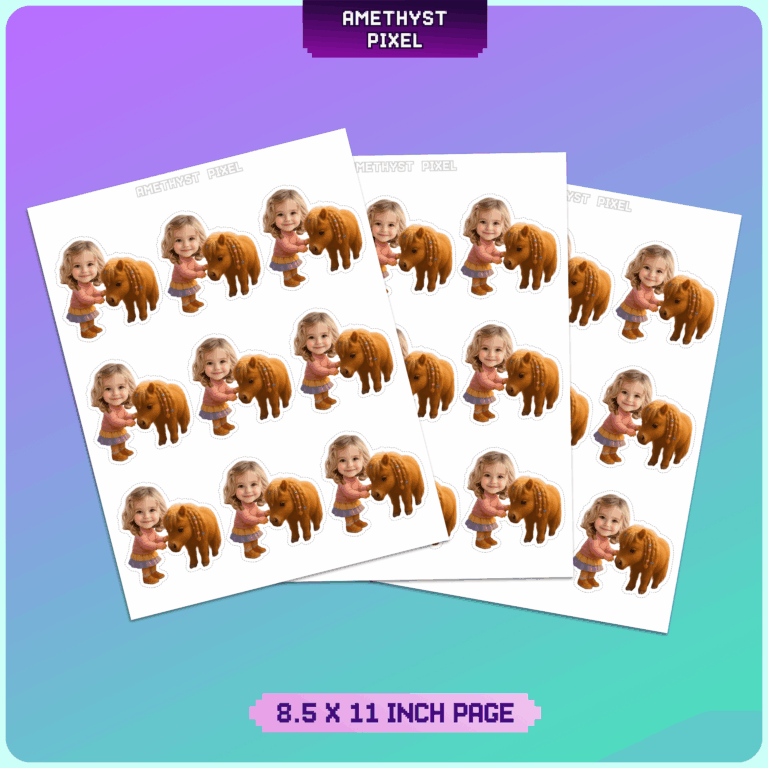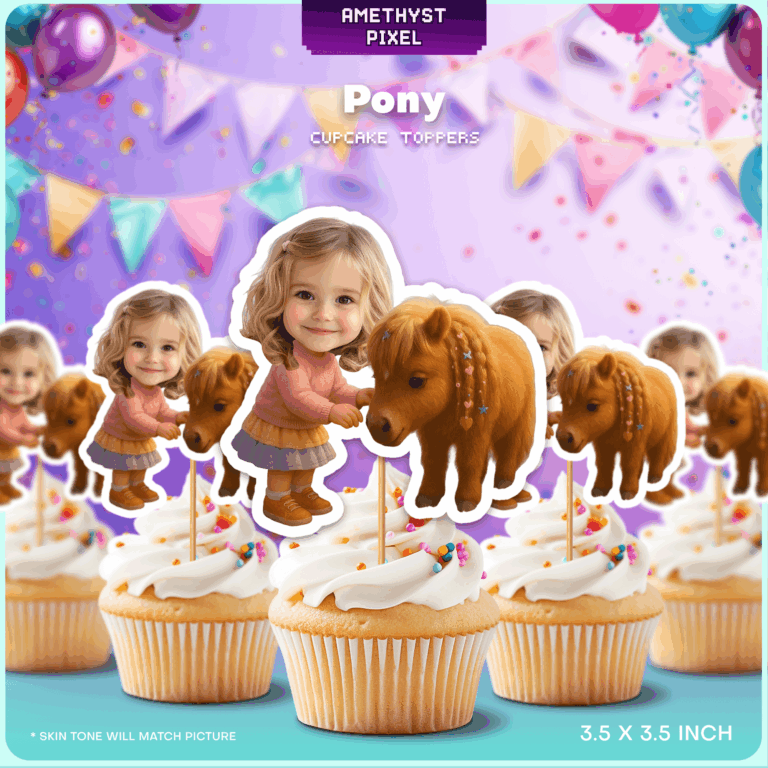 Transform your little girl's birthday celebration into a charming equestrian adventure with these personalized pony cupcake toppers. Designed primarily for toddlers and young children who adore animals, this printable party decoration features a sweet brown pony with braided mane accessories standing next to a customizable character body in a cute pink sweater and skirt. By adding your child's photo to the design, you create a hilarious and heartwarming focal point for the dessert table that guests will love. As a digital download, these files allow you to print exactly as many as you need from home, offering a flexible and high-quality DIY solution for creating memorable party decor. The clear outlines make cutting simple, ensuring a fun crafting experience before the big day.