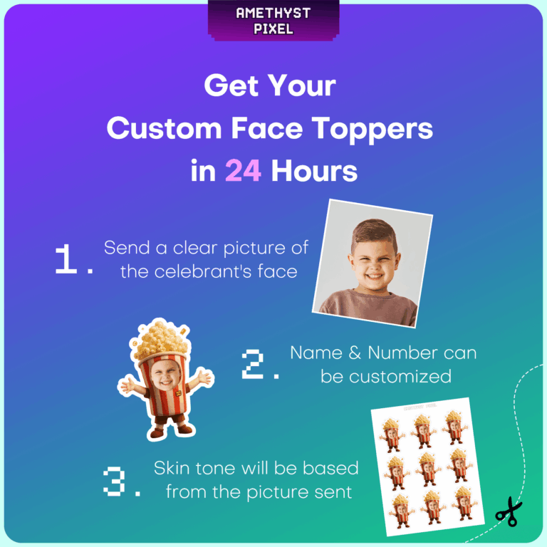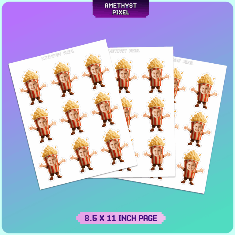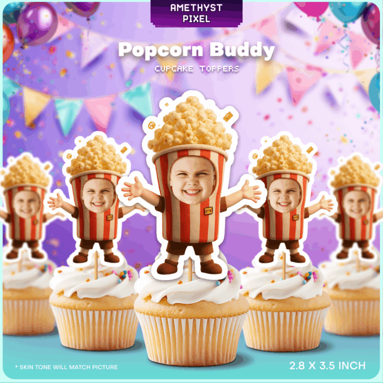 Transform your guest of honor into an adorable Popcorn Buddy with these custom face cupcake toppers. Featuring a classic red-and-white striped bucket body, open arms, and a fluffy mound of popcorn on top, this design captures the fun of the cinema or a festive carnival. This digital download allows you to print as many as you need at home, making it a budget-friendly and hilarious addition to your dessert table. Best suited for children and toddlers celebrating a movie night birthday, circus theme, or carnival event, these toppers add a personalized touch that guests will love. Simply upload a clear, front-facing photo, and receive a high-resolution file ready for printing and cutting.