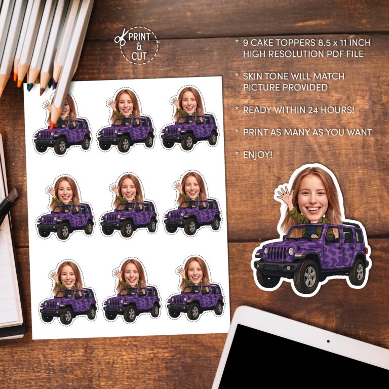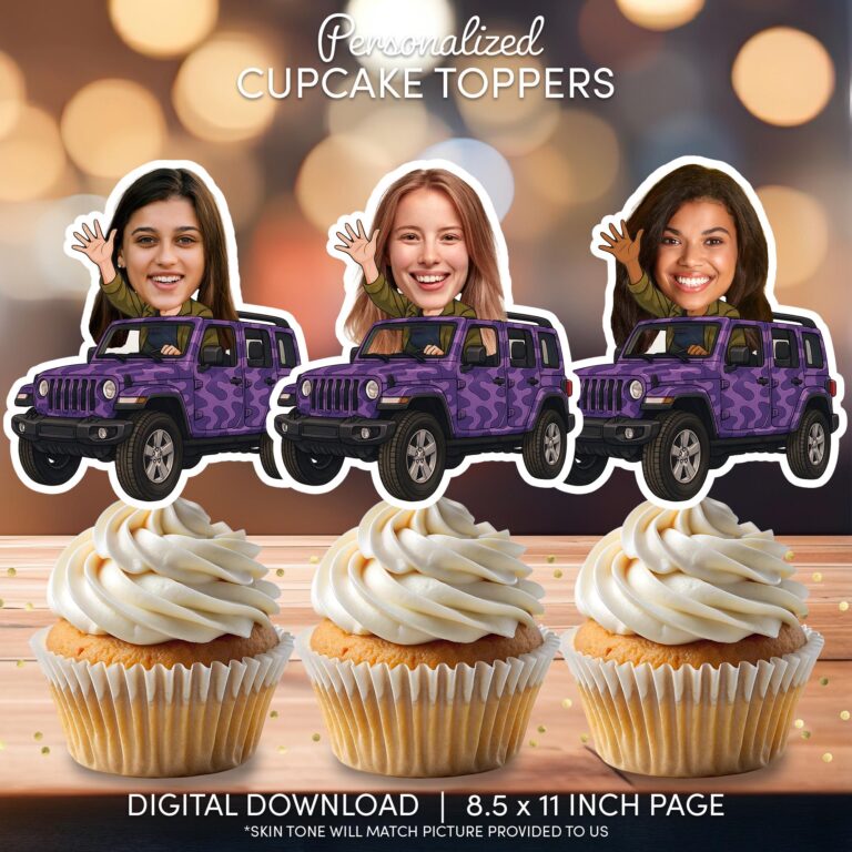 Rev up the excitement for a milestone birthday with these custom photo cupcake toppers featuring a rugged off-road theme. Designed primarily for teens celebrating a Sweet 16 or obtaining a driver's license, this printable decoration showcases the birthday girl driving a purple camouflage SUV while waving enthusiastically. We expertly crop your submitted photo and superimpose the face onto the driver, ensuring the cartoon hand skin tone matches the picture provided for a seamless look. This high-resolution digital file allows you to print vibrant, personalized decor right from home, effortlessly transforming plain cupcakes into a conversation starter at your off-road or outdoor adventure event.