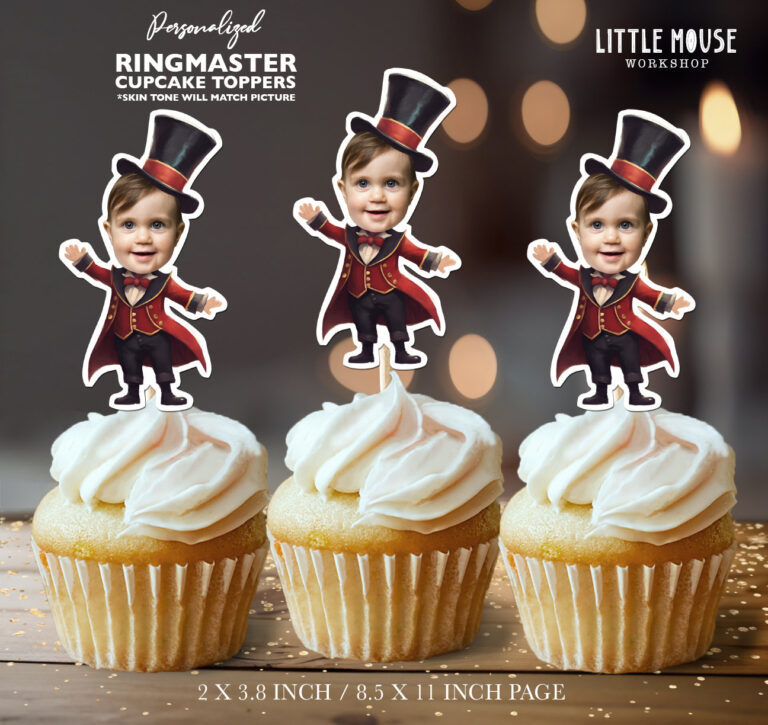 Custom Face Ringmaster Circus Cupcake Toppers – Printable Carnival Birthday Decor