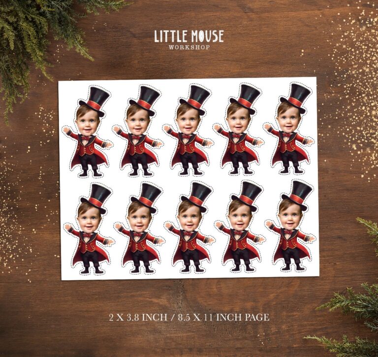 Elevate your circus or carnival-themed celebration by featuring the birthday child as the star of the show with these custom photo ringmaster cupcake toppers. Designed to capture the whimsy of the big top, this printable decoration showcases your toddler or baby wearing a detailed red ringmaster tailcoat, black bow tie, and a majestic top hat. Perfect for a "Greatest Show" first birthday, these high-resolution cutouts measure 2 x 3.8 inches and print easily on standard 8.5 x 11-inch cardstock. Simply upload a clear photo to create a hilarious and heartwarming centerpiece for your dessert spread that guests will instantly recognize and adore.