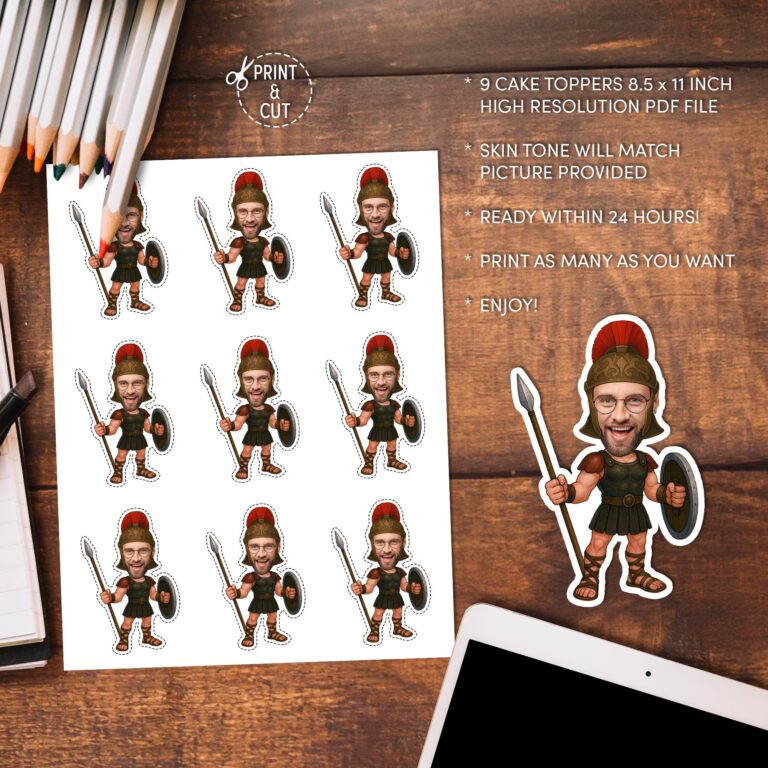 Transform the guest of honor into a legendary hero for their next big celebration with these custom Roman gladiator cupcake toppers. Designed primarily for adult birthdays, bachelor parties, or retirement events, this digital design features a muscular armored body holding a spear and shield, complete with a classic red-crested helmet. You simply provide a clear photo, and the face is professionally cropped and adjusted to blend with the warrior body, including skin tone matching where possible. As a printable file, this offers the flexibility to print as many copies as you need from home or a local print shop. For a sturdy, high-quality finish on your dessert table, these are best printed on premium cardstock and attached to standard wooden picks.