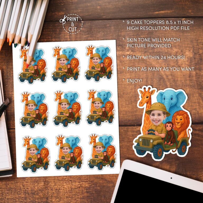 Transform your little explorer into the star of their own wild adventure with these custom safari cupcake toppers, perfect for toddlers and young children. This printable design features your child's face wearing a classic pith helmet, driving a rugged green jeep alongside a friendly crew of jungle animals, including a giraffe, blue elephant, lion, and monkey. Ideal for a "Wild One" first birthday or a zoo-themed celebration, these digital decorations bring a vibrant, personalized touch to your dessert table. The file is formatted for easy cutting, allowing you to create high-quality party accents right from home using your own photo.