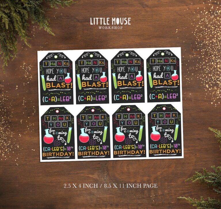 Conclude your young researcher's celebration with these professionally designed Science Birthday Thank You Tags, perfect for a chemistry or Mad Scientist themed event. Featuring a realistic dark chalkboard background, these printable tags utilize clever Periodic Table element typography to spell "THANKS" alongside vibrant illustrations of bubbling beakers, test tubes, and atomic structures. The playful text, "Hope You Had a Blast," captures the energy of a STEM-focused 10th birthday or experiment party. Formatted as 2.5 x 4-inch labels on standard letter-sized paper, these downloadable tags are easy to print, trim, and hole-punch at home. They provide a high-quality, customized finish to party favors, ensuring the enthusiasm for science continues even after the experiments are over.