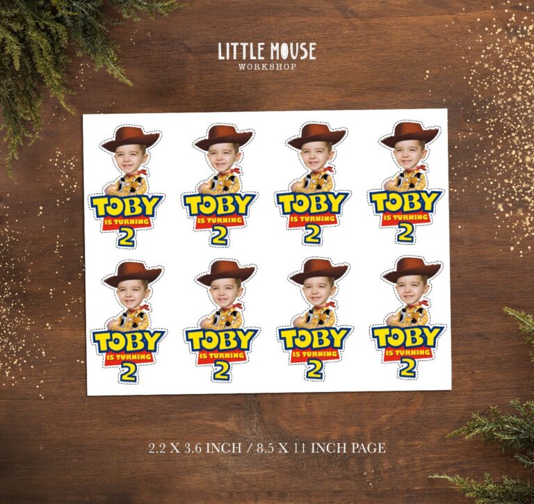 Make your little one the sheriff of their special day with these professionally designed custom face cupcake toppers, inspired by the beloved Toy Story franchise. Perfect for a toddler’s “Two Infinity and Beyond” celebration or a classic western theme, this printable decoration features your child’s smiling face edited under a signature brown cowboy hat and atop Woody’s recognizable yellow plaid shirt and cow-print vest. The bold, playful logo below the character is fully personalized with the birthday boy's name and age, replicating the iconic movie font style in vibrant blue, yellow, and red. Measuring 2.2 by 3.6 inches, these high-resolution toppers are sized to create an immediate visual impact on your dessert table while remaining easy to cut and assemble at home, ensuring a memorable and photogenic party setup.