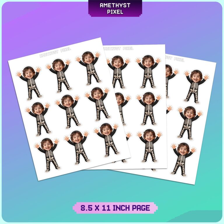 Elevate your October festivities with these personalized skeleton costume Halloween cupcake toppers, expertly designed to showcase your toddler’s face on a classic spooky figure. The design features a charming child-size black bodysuit illustrated with distinct white skeletal bones, including a ribcage, pelvis, and leg bones, finished with playful bare foot details. With arms raised high in a cheerful gesture, this decoration captures the excitement of trick-or-treating for the toddler and preschool age group. Ideal for creating a cohesive 'spooky season' aesthetic, these custom toppers turn standard bakery treats into conversation starters. The high-resolution imagery ensures that when you print and cut these at home, the contrast between the black costume and your child’s photo remains sharp and professional.