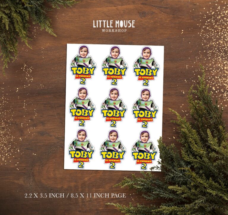 Blast off into an unforgettable celebration with these custom Space Ranger face cupcake toppers, the ultimate addition to any 'Two Infinity and Beyond' or Toy Story-themed birthday bash. Expertly designed to feature your toddler’s smiling face inside the iconic purple and green space suit, these toppers transform a standard dessert table into an intergalactic experience. The design incorporates distinct logo-style typography, shown here with 'Toby Is Turning 2,' capturing the playful energy of the beloved movie franchise. Perfect for parents seeking DIY printable party decor that looks professionally made, these toppers measure approximately 2.2 x 3.5 inches and print seamlessly on standard 8.5 x 11 photo paper. Whether you are celebrating a 2nd birthday or a general space adventure, these personalized photo picks ensure the birthday child remains the star of the galaxy.