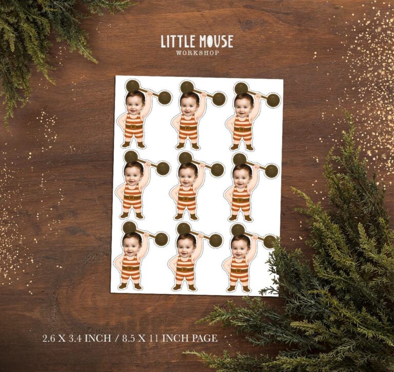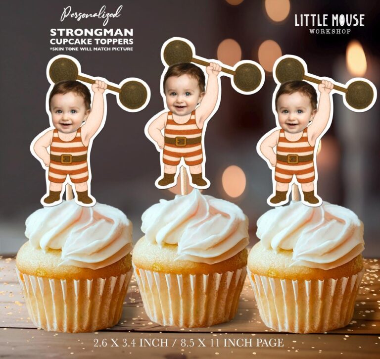 Transform your dessert table into a spectacle of strength and cuteness with these custom strongman cupcake toppers. Perfectly suited for a vintage circus or carnival-themed first birthday, this design features a classic muscle man in a red and white striped singlet effortlessly pressing a heavy barbell overhead. By integrating your babyâs photo onto the illustrated body, we create a hilarious and heartwarming centerpiece for your cupcakes. These printable files are optimized for easy cutting and assembly, ensuring a high-quality finish that matches professional event standards. Whether you are hosting a 'Strongest Boy' party or a traditional Big Top celebration, these personalized decorations provide a memorable, expert-level touch to your special event.