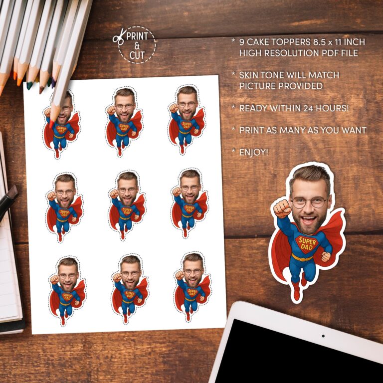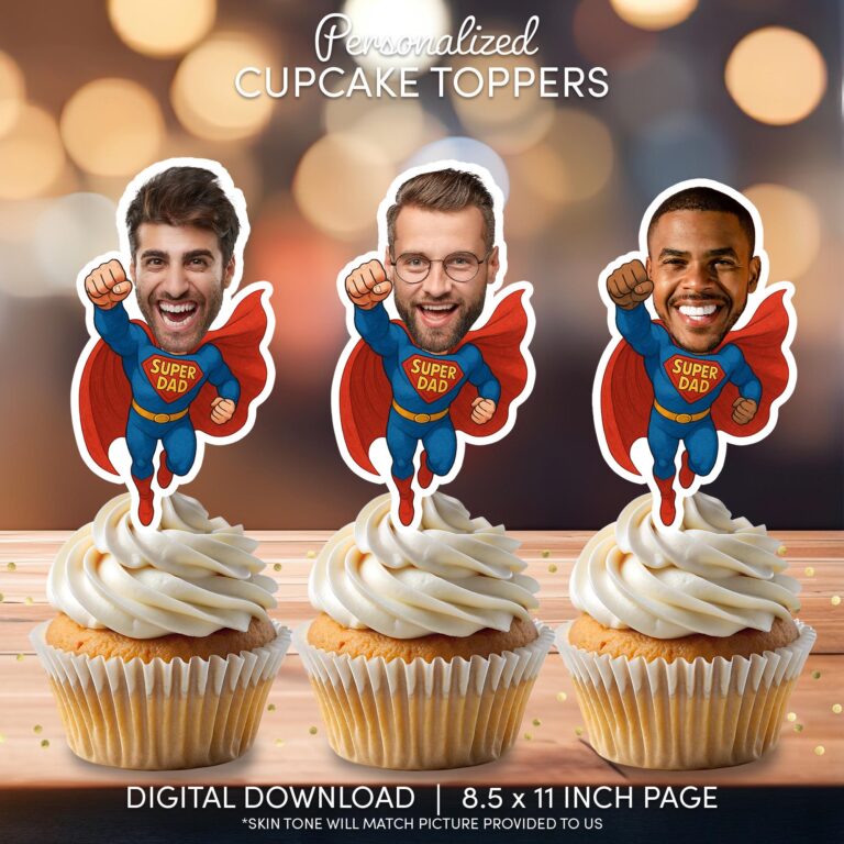 Celebrate the hero of the household with these custom Super Dad cupcake toppers, designed to turn a favorite photo into a fun, superhero-themed party decoration. This digital download service involves placing your provided face photo onto a classic comic-book style body, complete with a blue suit, flowing red cape, and the "SUPER DAD" emblem on the chest. The design process includes adjusting the illustrated neck skin tone to better match the subject's complexion for a cohesive look. Ideal for adult birthdays or Father's Day celebrations, these printable files allow you to create unlimited decorations from the comfort of your home. Simply print on high-quality paper, cut out the shapes, and add them to desserts for a memorable, personalized tribute.