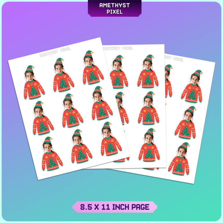 Bring laughter and festive cheer to your holiday event with these custom Christmas sweater cupcake toppers. This printable design features a classic red holiday sweater decorated with a Christmas tree and stars, paired with a matching green patterned elf hat to complete the look. Ideal for adults, teens, and families, these toppers turn your guest of honor—or the whole family—into festive characters perfect for the season. Simply upload a clear photo to create a hilarious personalized decoration that guests will love. As a digital download, you receive a high-quality file formatted for easy home printing, allowing you to create a memorable dessert display for any winter gathering without waiting for shipping.
