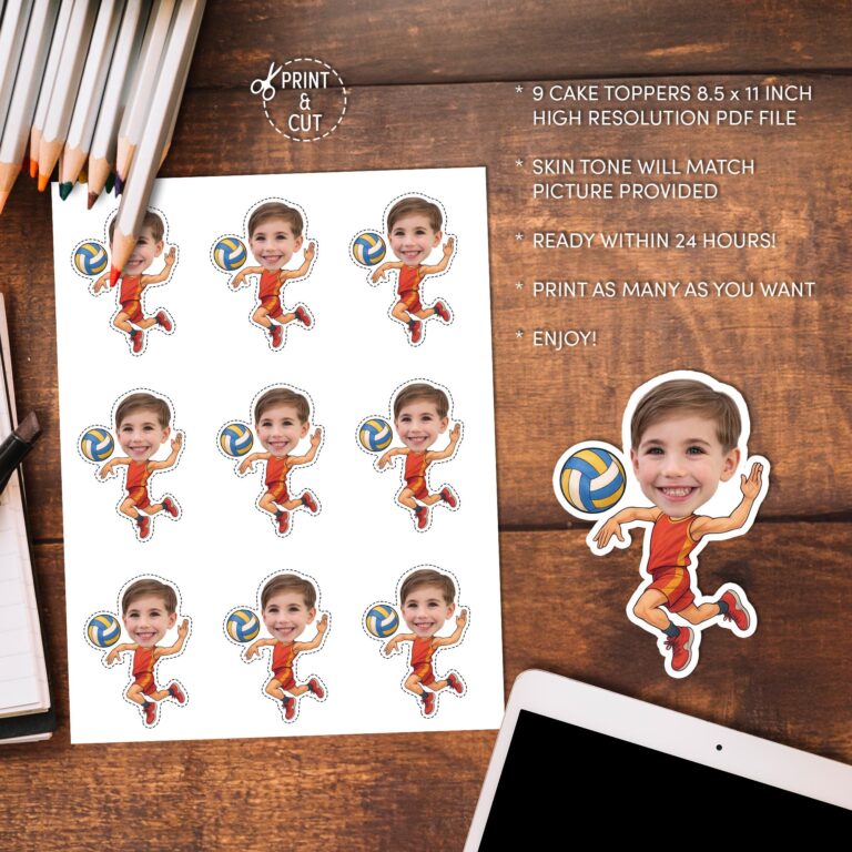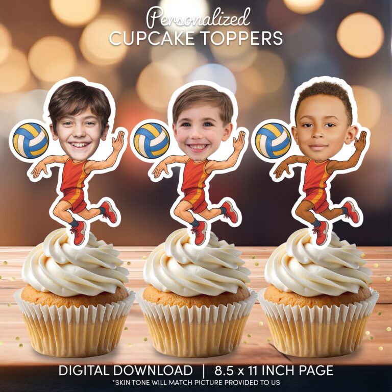 Serve up a winning celebration with these energetic volleyball player cupcake toppers featuring the guest of honor's face. Capturing the dynamic action of a mid-air spike, these printable decorations add a humorous and personalized touch to any sports-themed event. The design showcases an athletic cartoon body in a vibrant uniform, holding a volleyball, with the skin tone adjusted to match the photo provided for a seamless look. Ideal for children, pre-teens, and youth volleyball teams, this digital download empowers you to create unlimited party accents from home. Simply print on quality paper and cut around the design to transform plain desserts into a spirited team tribute.