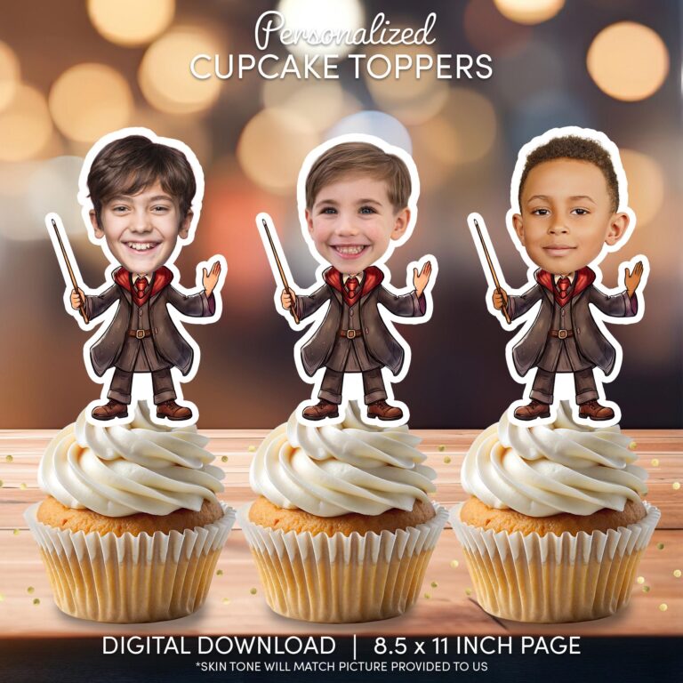 Add a touch of enchantment to your celebration with these personalized wizard cupcake toppers, designed to transform your guest of honor into a spell-casting student. Perfect for a magic school birthday theme, this printable design features a custom face superimposed onto a young wizard body, dressed in a classic robe with a striped tie and holding a wand ready for charms class. The illustration is carefully adapted so the cartoon skin tone matches your submitted photo, creating a cohesive and festive look. Ideal for school-aged children and fans of fantasy stories, these DIY decorations are delivered as high-resolution digital files that you can print right at home to upgrade your dessert table instanly.